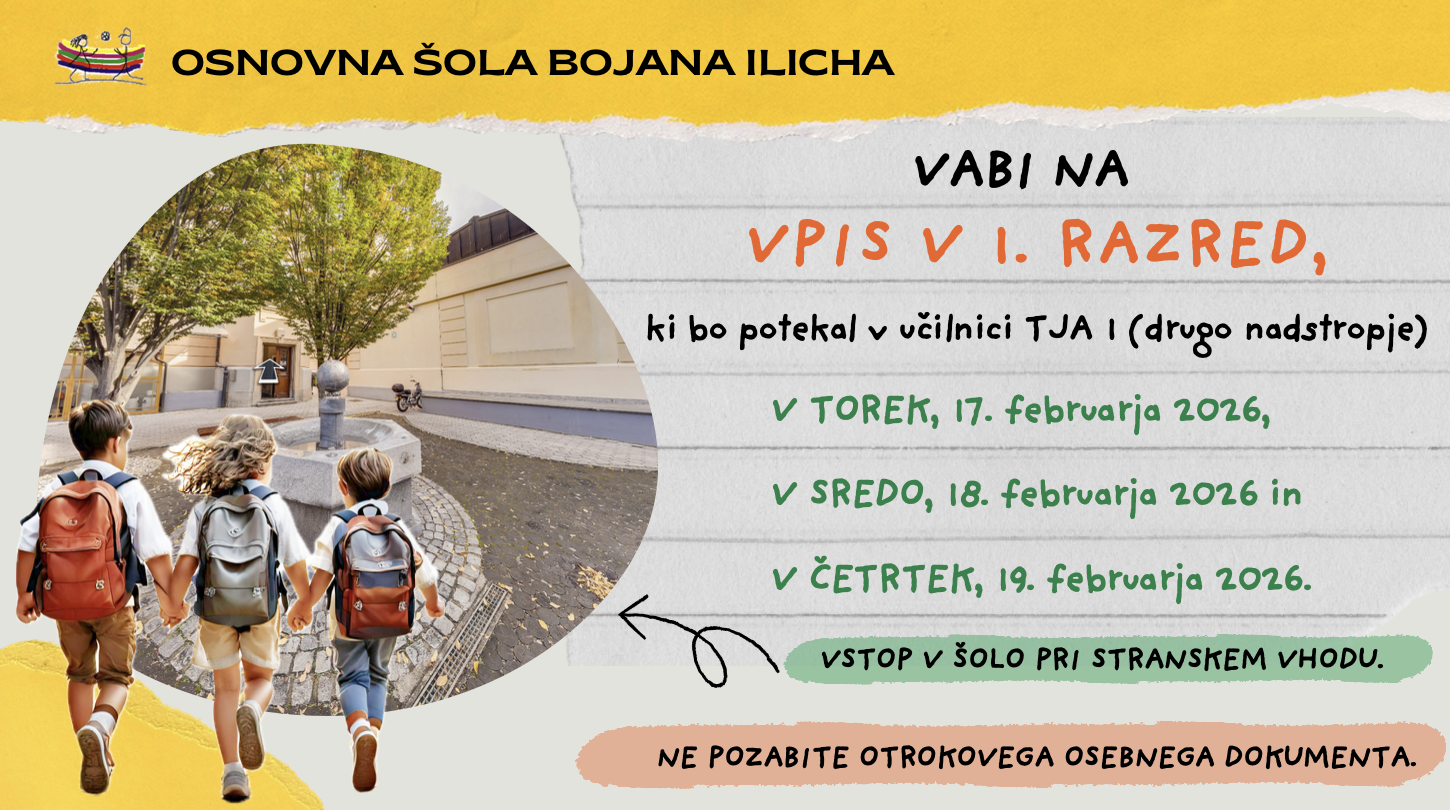 OŠ Bojana Ilicha Vas vabi na vpis v 1. razred, ki bo potekal v učilnici TJA 1 (stranski vhod, 2. nadstropje) v torek, 17. februarja, v sredo, 18. februarja in v četrtek, 19. februarja 2026. Šolski novinci iz našega šolskega okoliša bodo k vpisu vabljeni pisno. Omenjene dneve bomo na šoli dosegljivi med 8:00 in 13:00 ter 16:00 in 18:00. Informacije v zvezi z razpisom za vpis otrok v prvi razred osnovne šole v šolskem letu 2025/2026 v osnovnih šolah na območju Mestne občine Maribor so dosegljive tudi na spletni strani MOM.